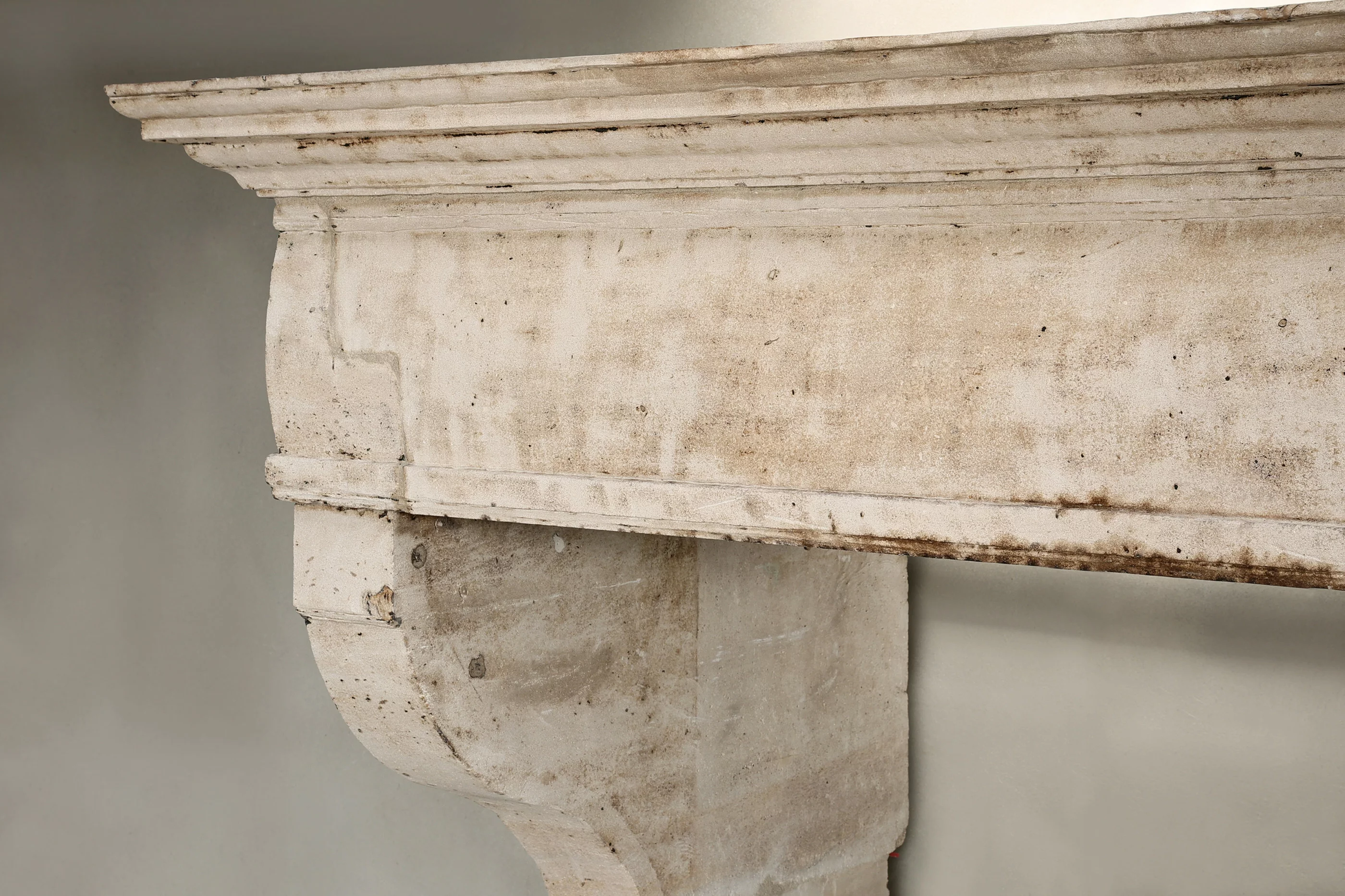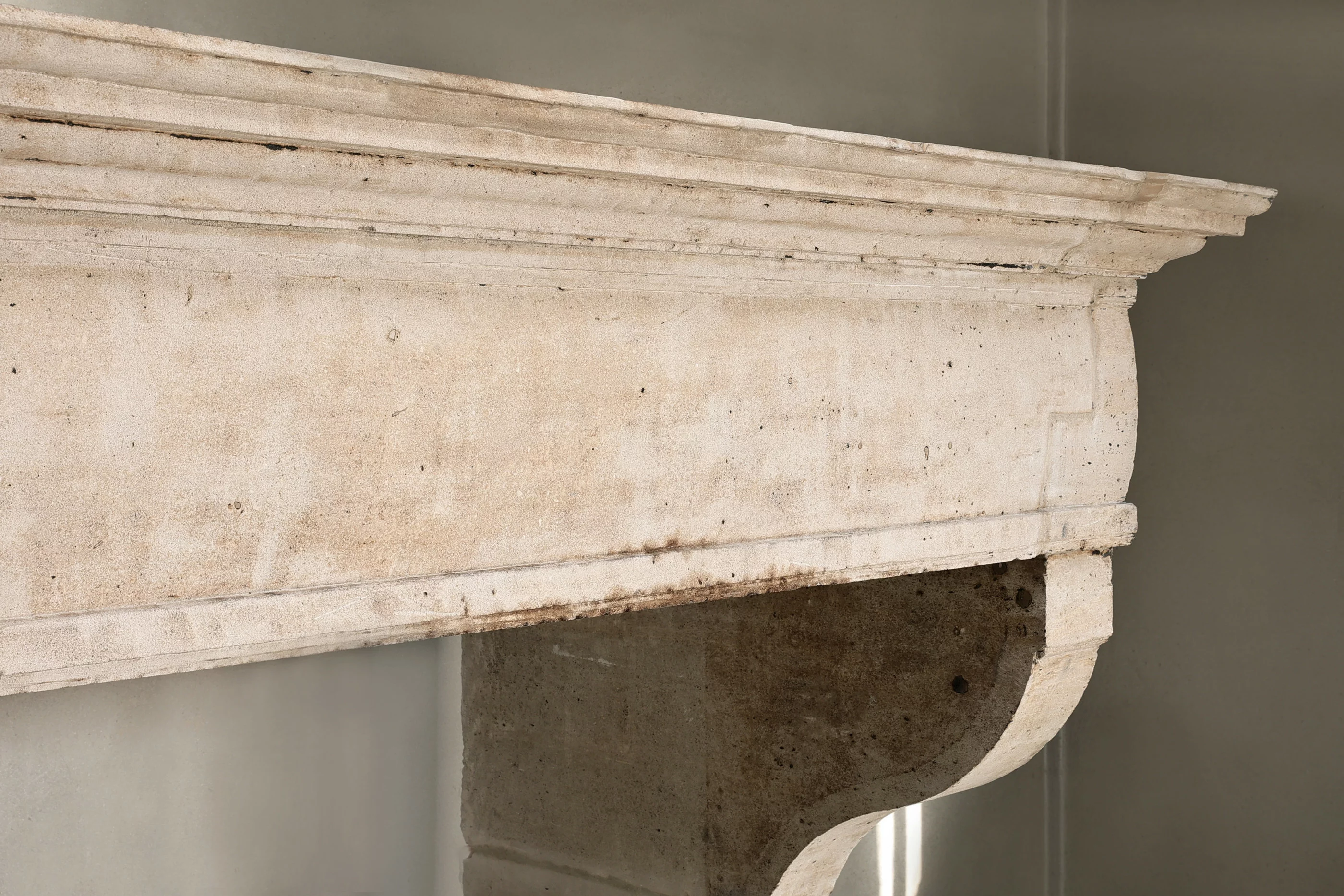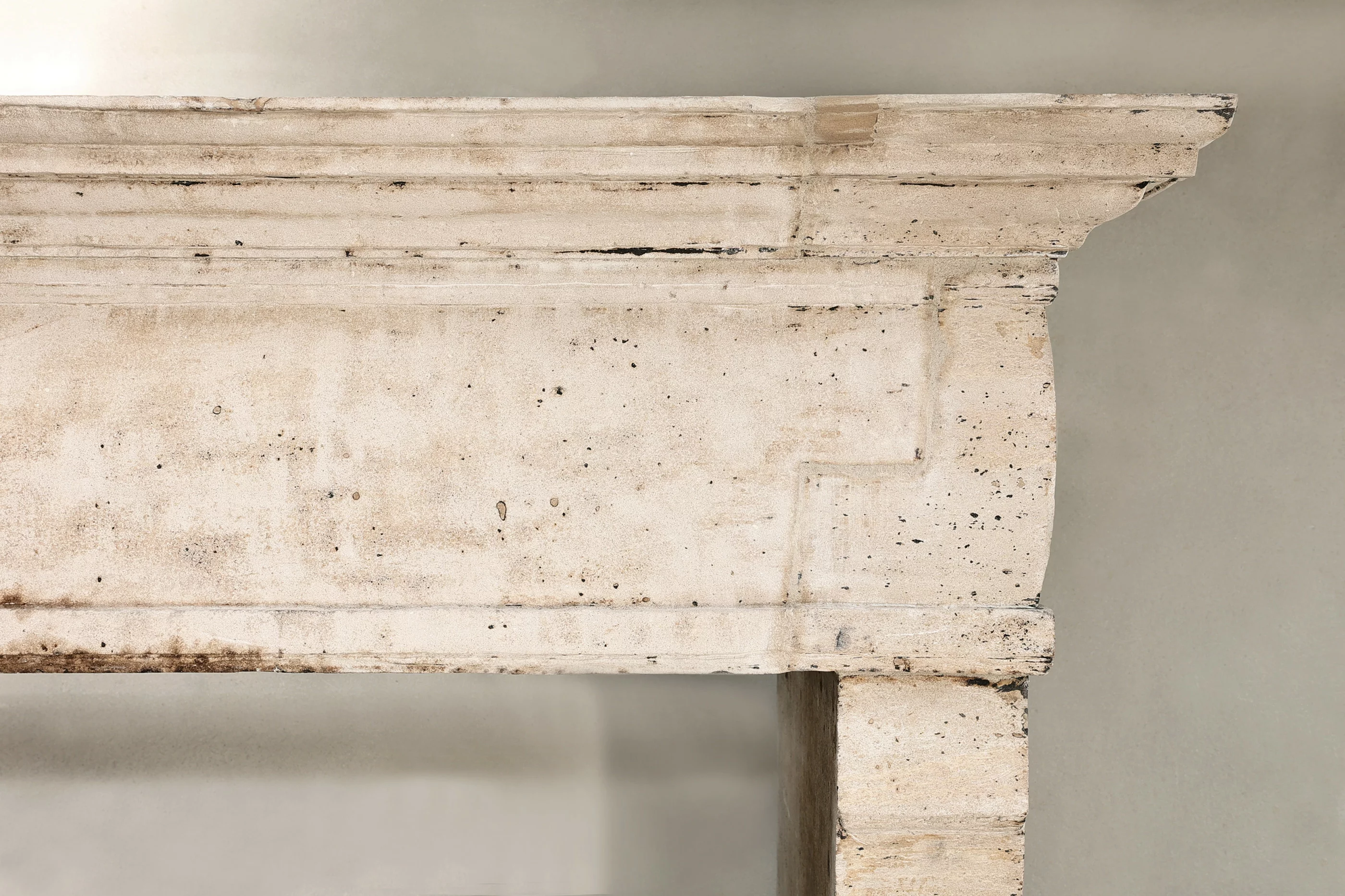 Zeer imposante kasteelschouw van Franse kalksteen uit de 19e eeuw. Deze antieke mantel heeft een prachtig breed frontgedeelte waardoor de schouw nog robuuster is! Het is een rustieke open haard met weinig ornamenten en mooie belijningen.