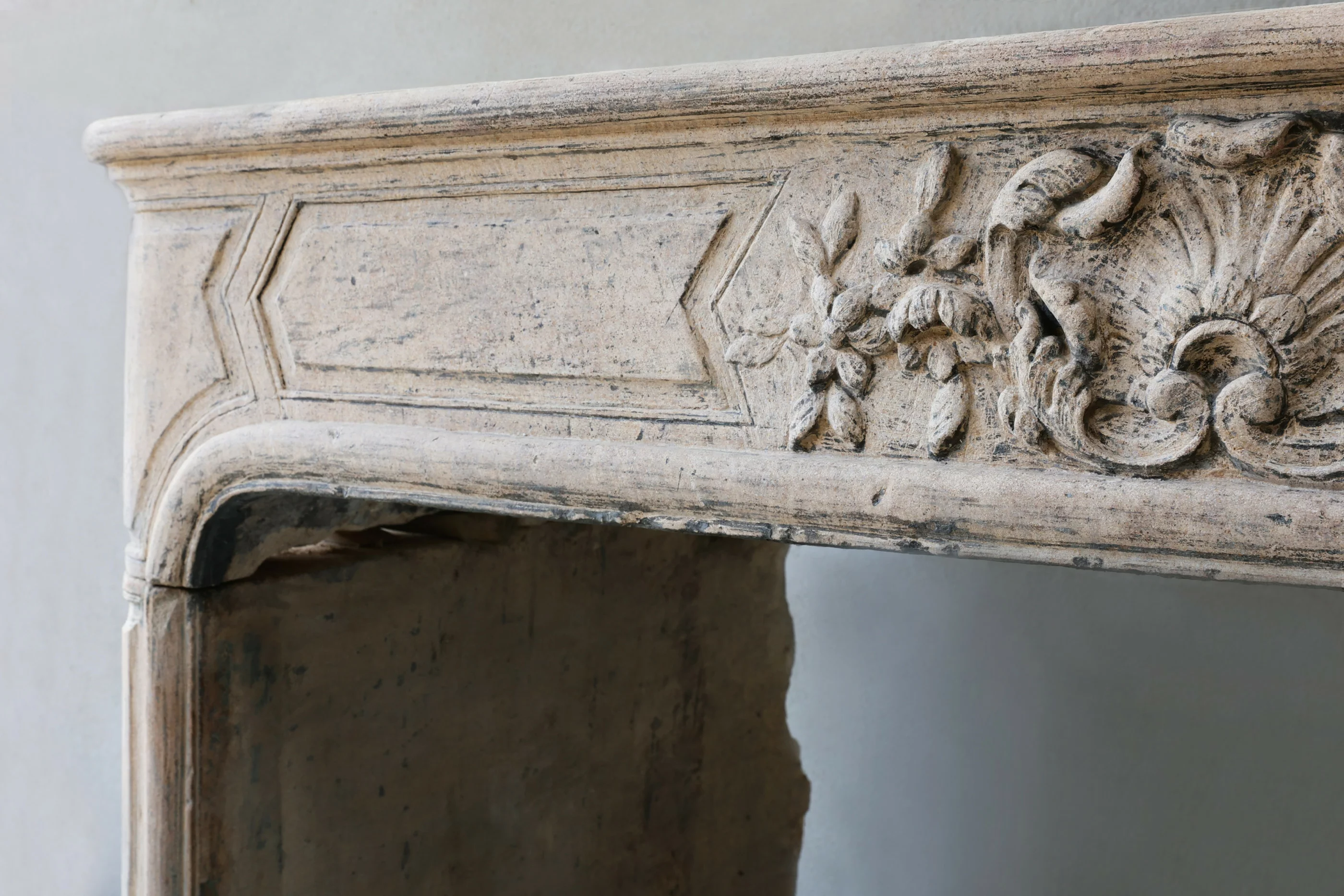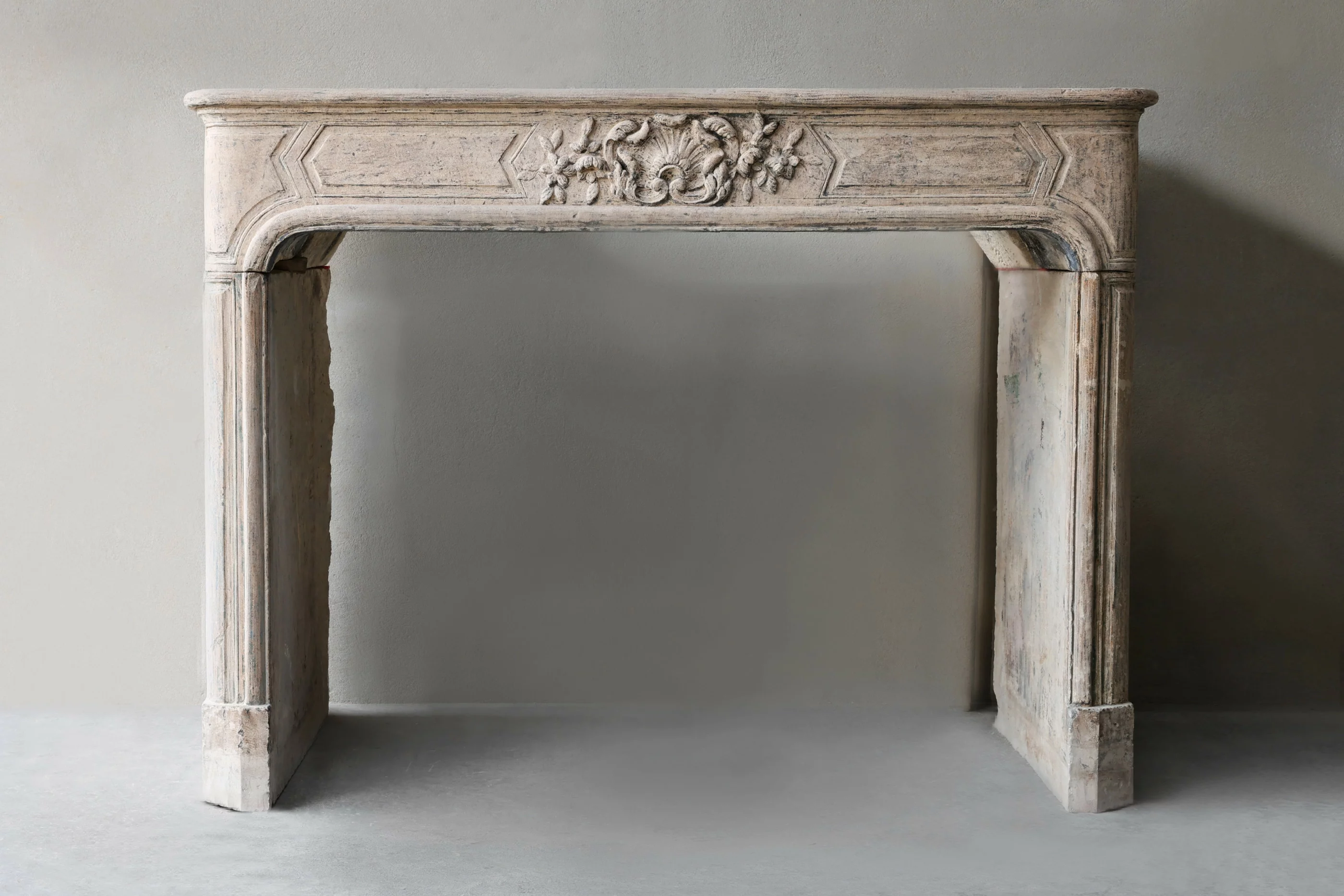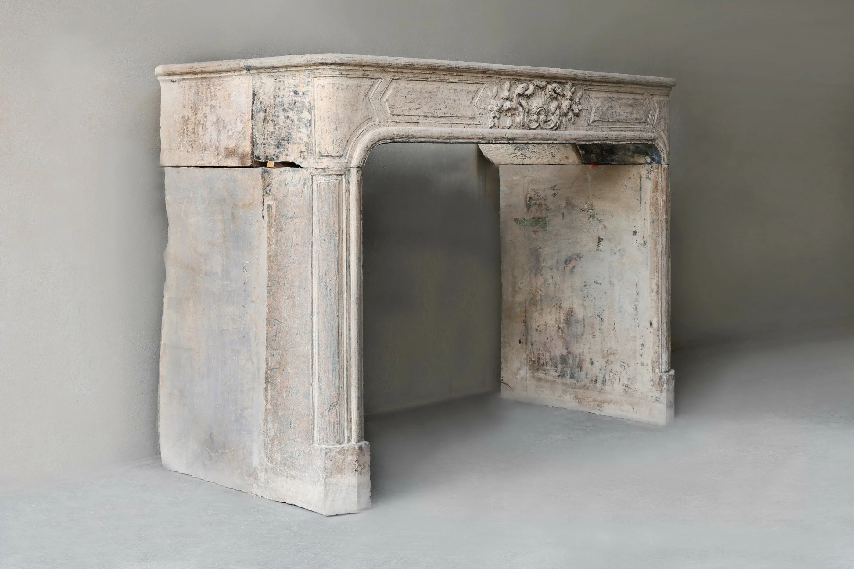 Prachtige tijdloze antieke schouw met veel elegantie vervaardigd uit authentieke Franse kalksteen uit de 19e eeuw. Deze schouw in stijl van Louis XIV heeft verfijnde details en een prachtige patina, waardoor de uitstraling nog authentieker wordt. Ook de ronde vormen en handgekapte bewerkingen zorgen voor sfeer en warmte in uw interieur.