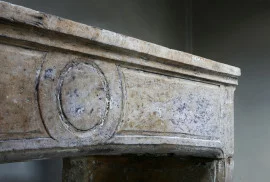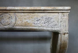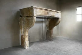 Prachtige robuuste antieke schouw uit de 19e eeuw van Franse kalksteen. Een schouw met karakter en uitstraling door de vorm en belijningen. Deze schouw is in de stijl van Campagnarde en heeft een ornament in het frontgedeelte. De benen zijn licht gebogen en voorzien van mooie belijningen.