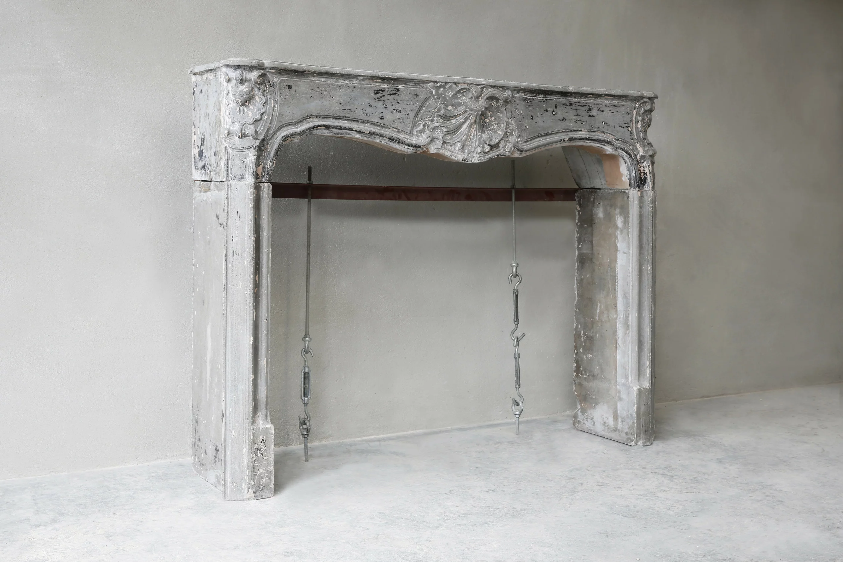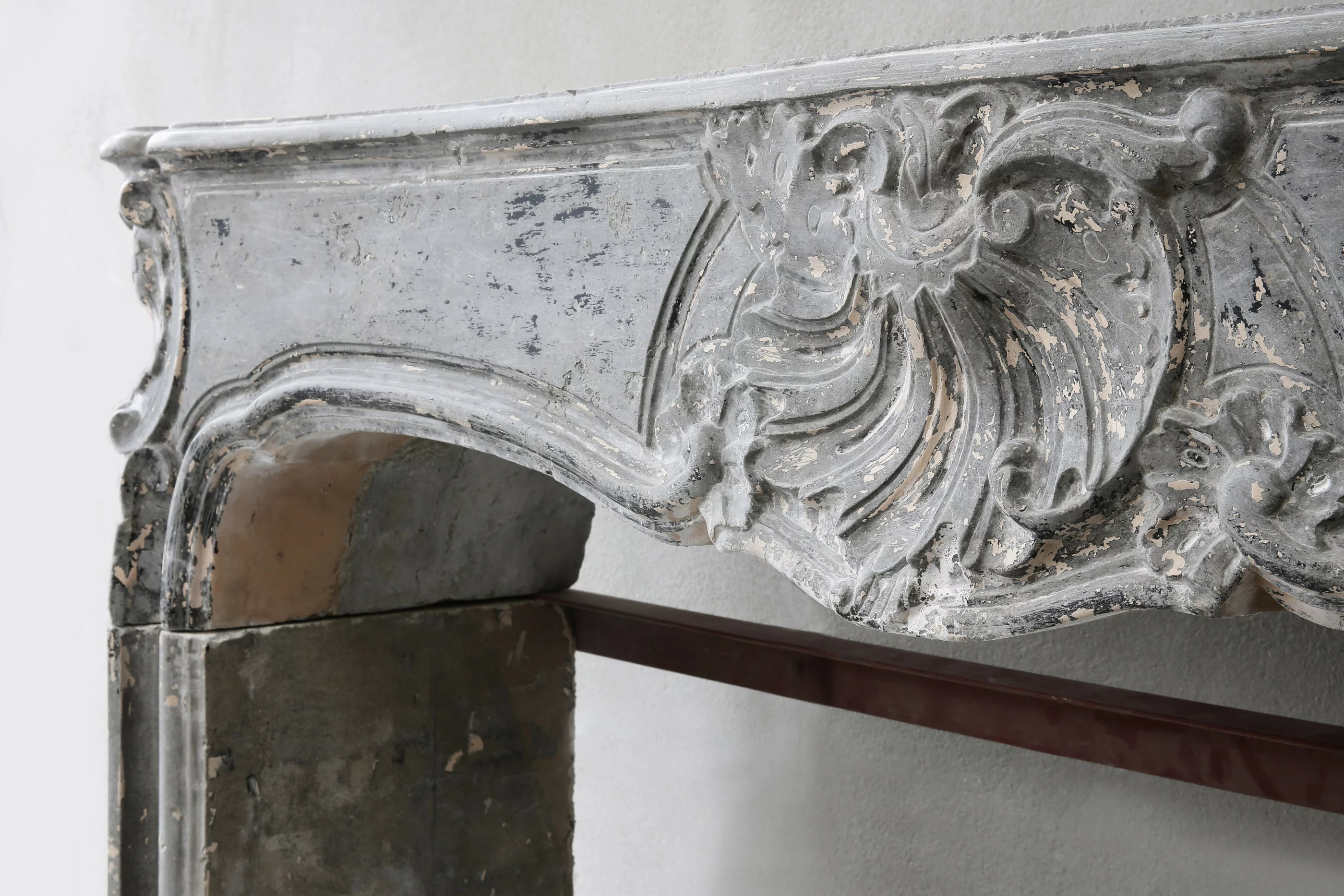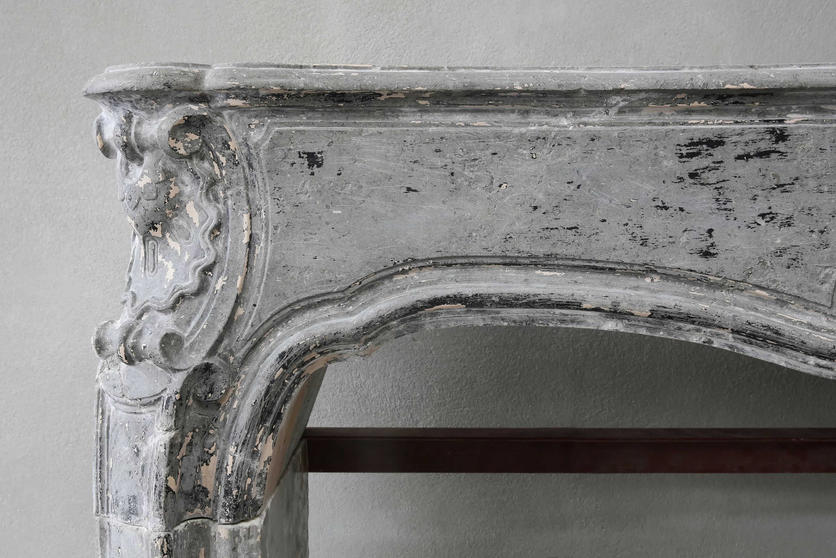 Prachtige antieke schouw van grijze marmersteen met mooie ronde vormen! Deze schouw is in stijl van Louis XV met in het midden van het frontgedeelte een schelp en twee schelpen aan het uiteinde van de benen. Dit noemen ze ook 'trois coquilles'.