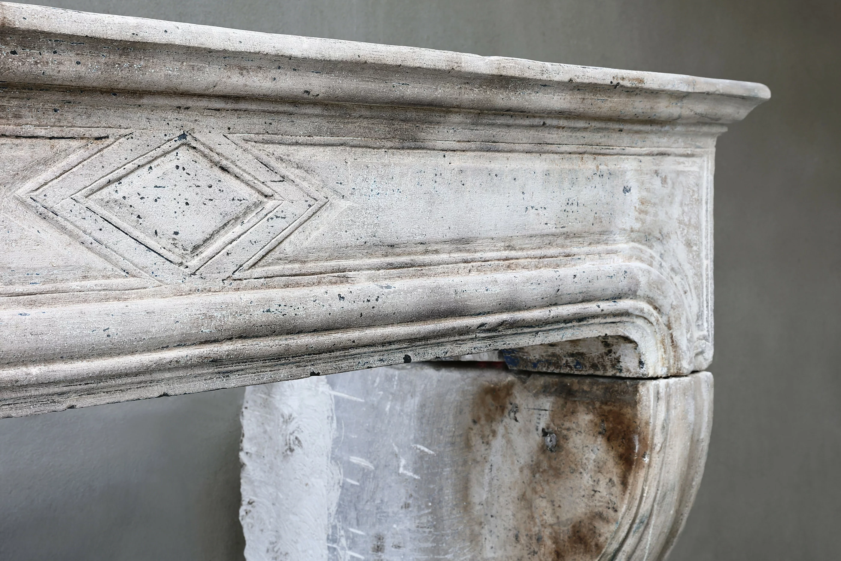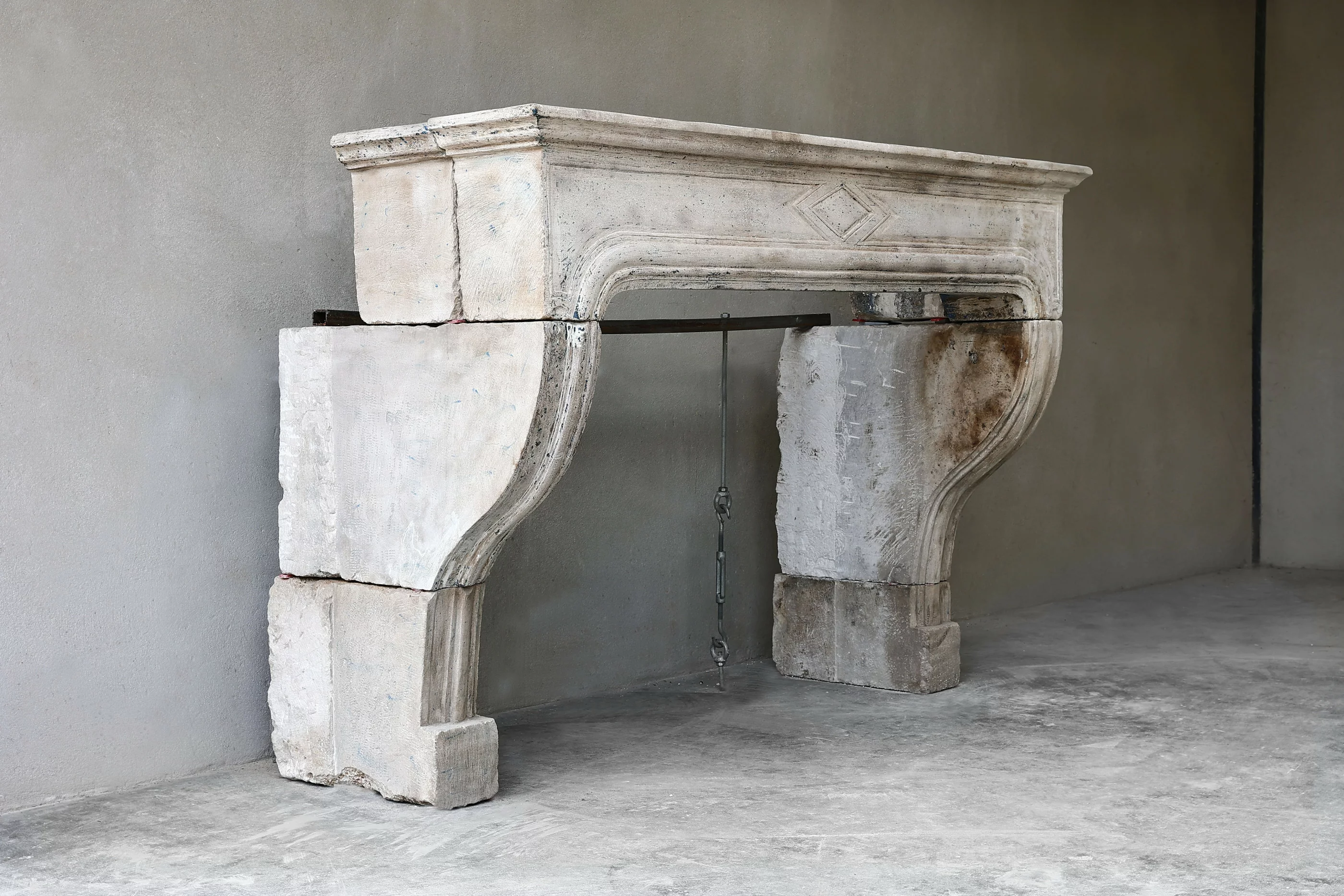 Elegante antieke schouw van Franse kalksteen in de stijl van Louis XIV. Deze oude Franse schouw is voorzien van een mooi ornament in het midden en een mooie moulure (belijningen). De schouw stamt uit de 19e eeuw en heeft een warme patinee.