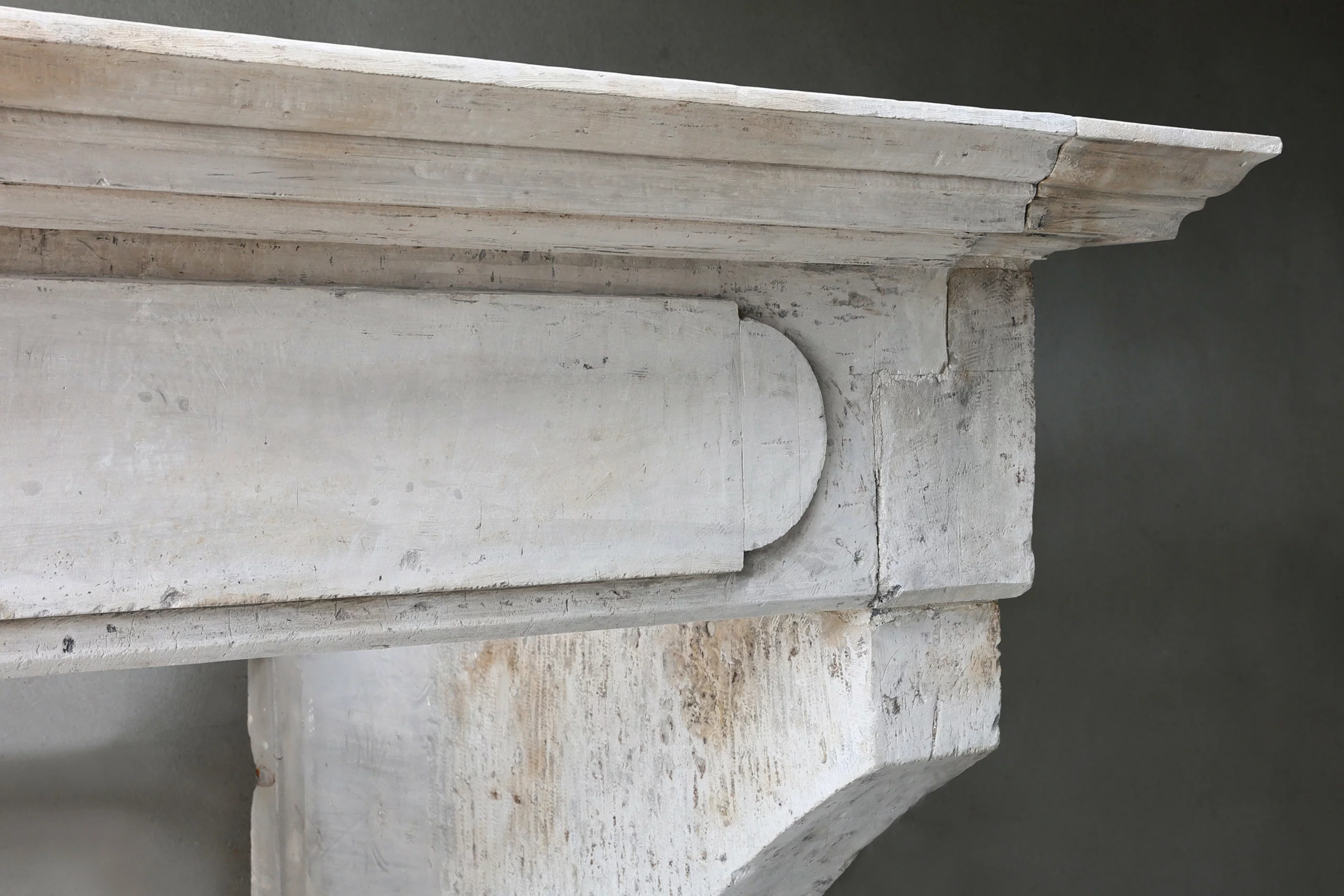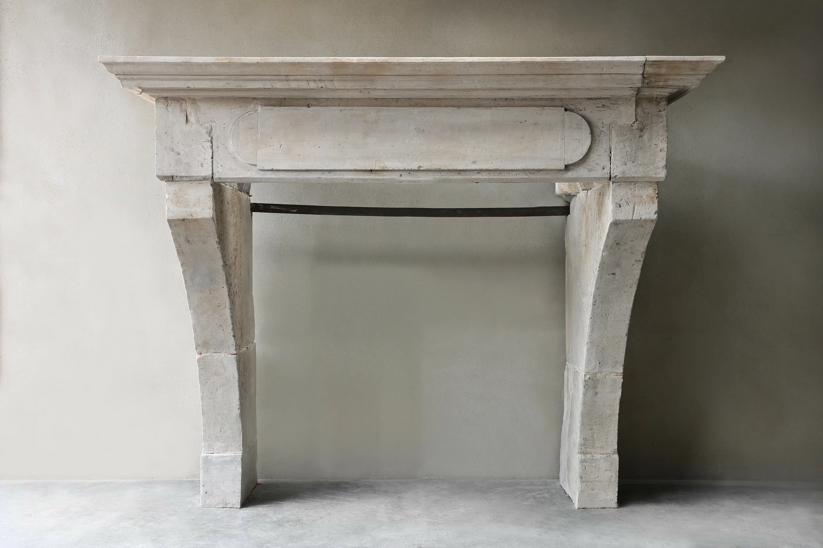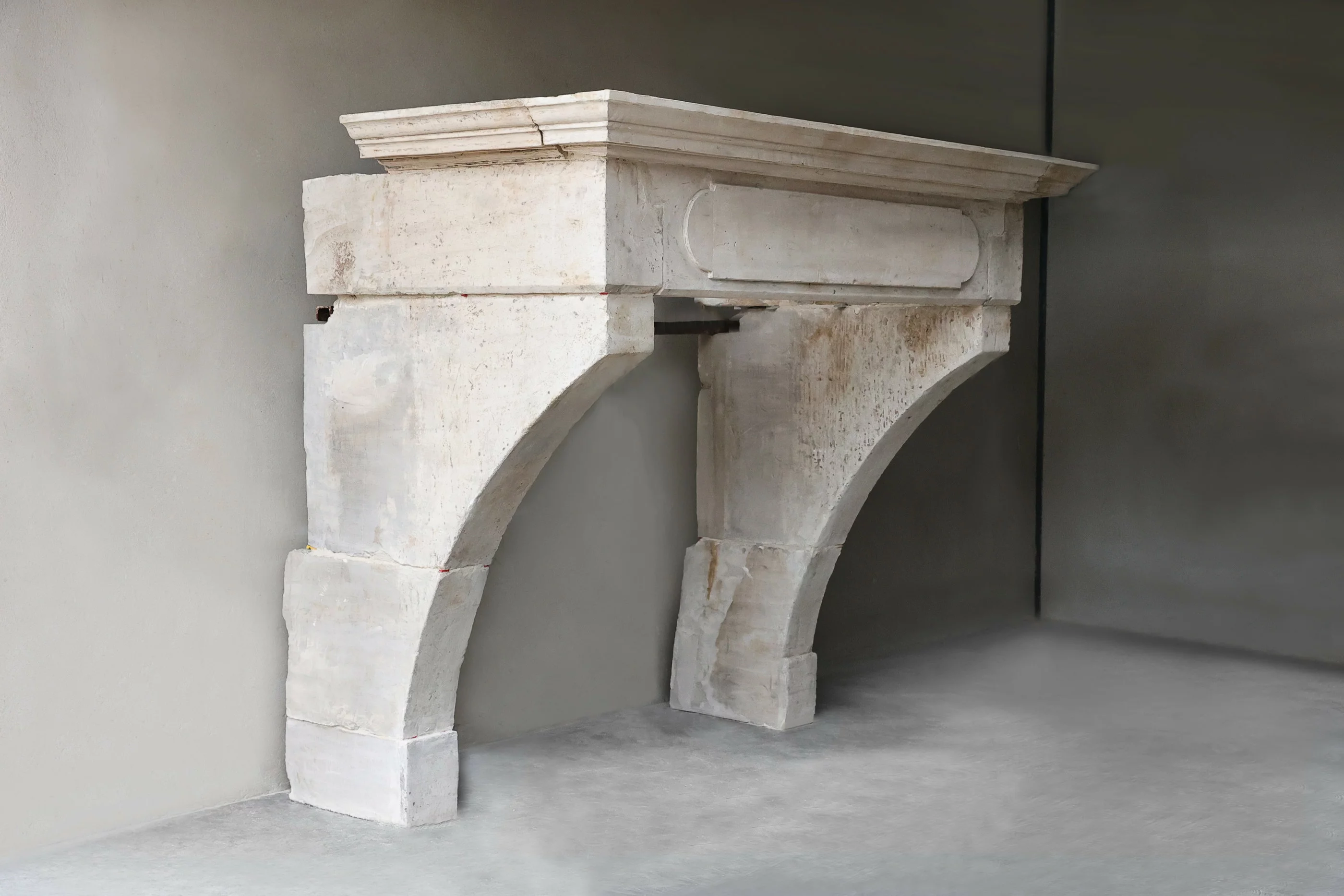 Prachtige robuuste kasteelschouw van Franse kalksteen. Deze antieke mantel stamt uit de 19e eeuw en is in stijl van Louis XIII met een mooi ornament in het midden van het frontgedeelte van de open haard. De vorm van de benen is obelisk, de schouw heeft een warme uitstraling met prachtige belijningen.