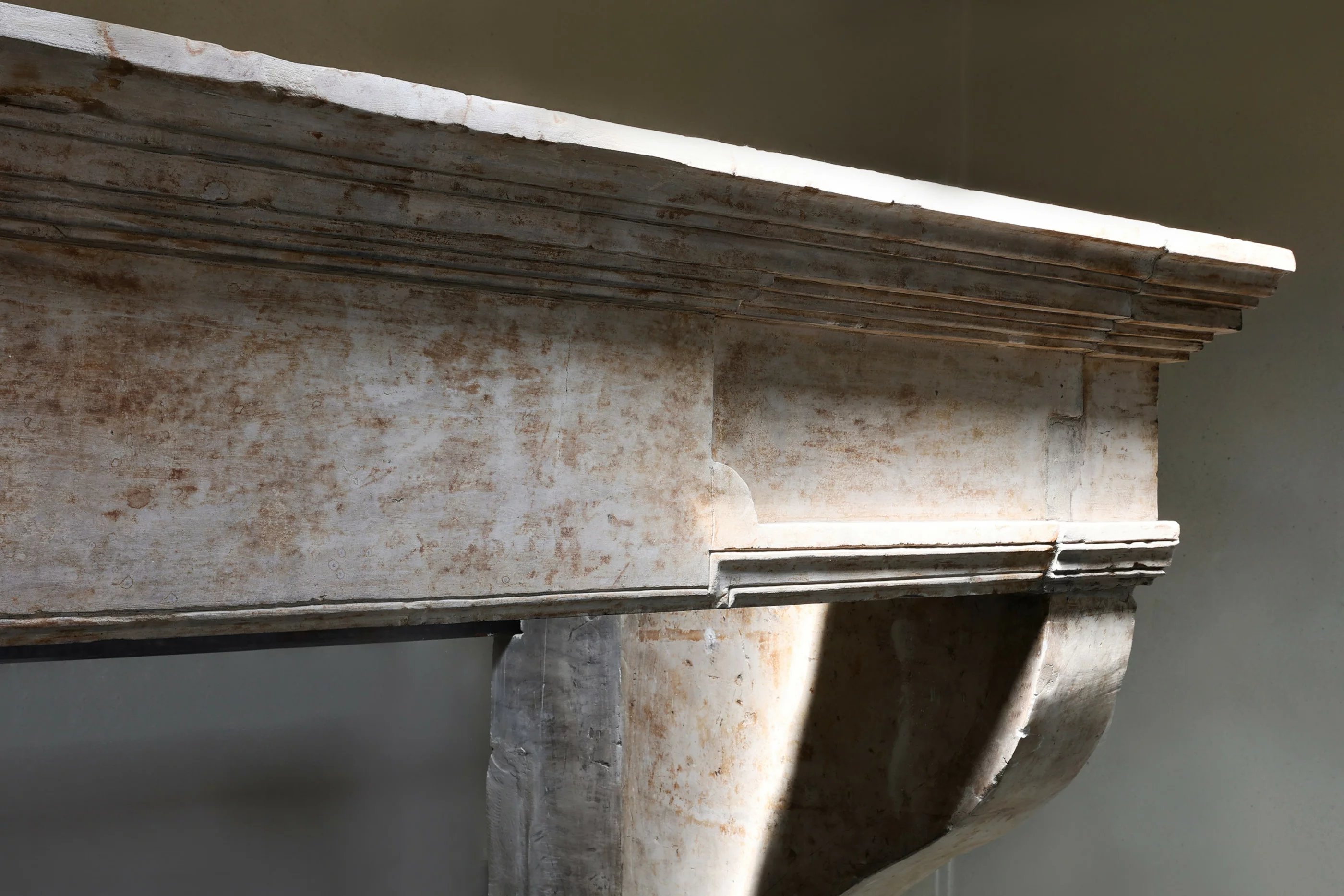 Robuuste consoles, ingetogen profileringen en een evenwichtige architraaf typeren de Louis XIII-esthetiek. De kalksteen toont een warme, historische gelaagdheid die zich prachtig laat combineren met moderne materialen.