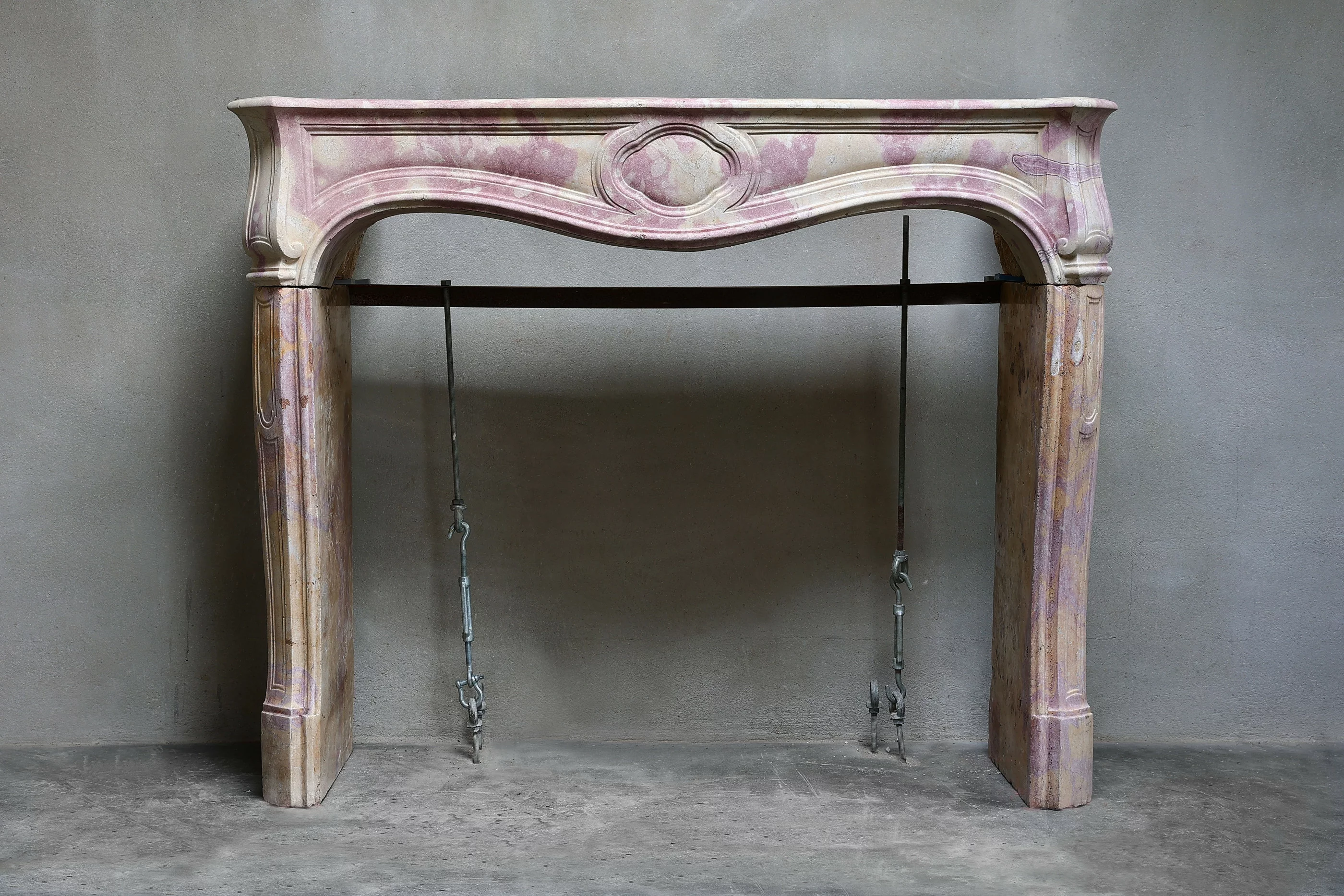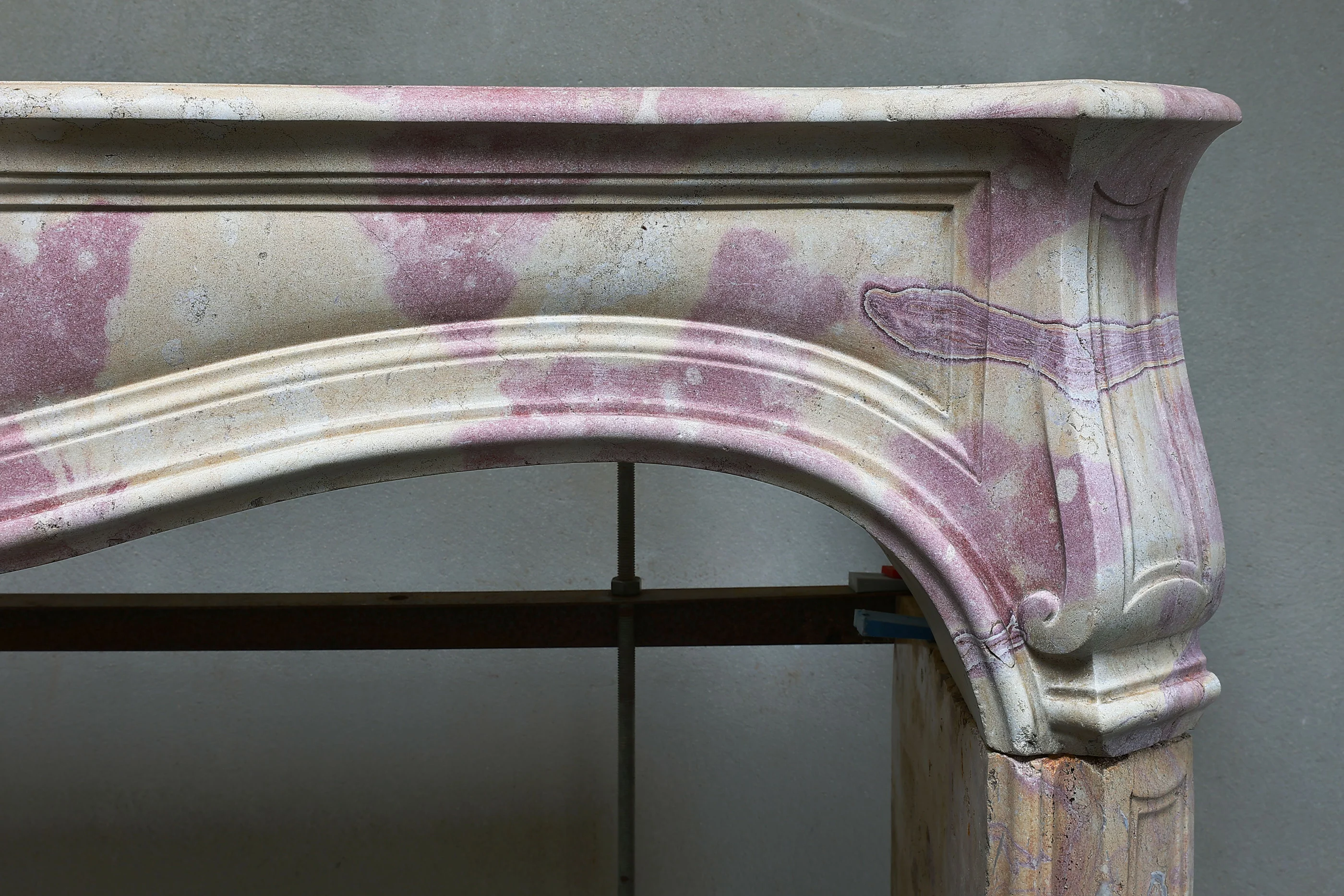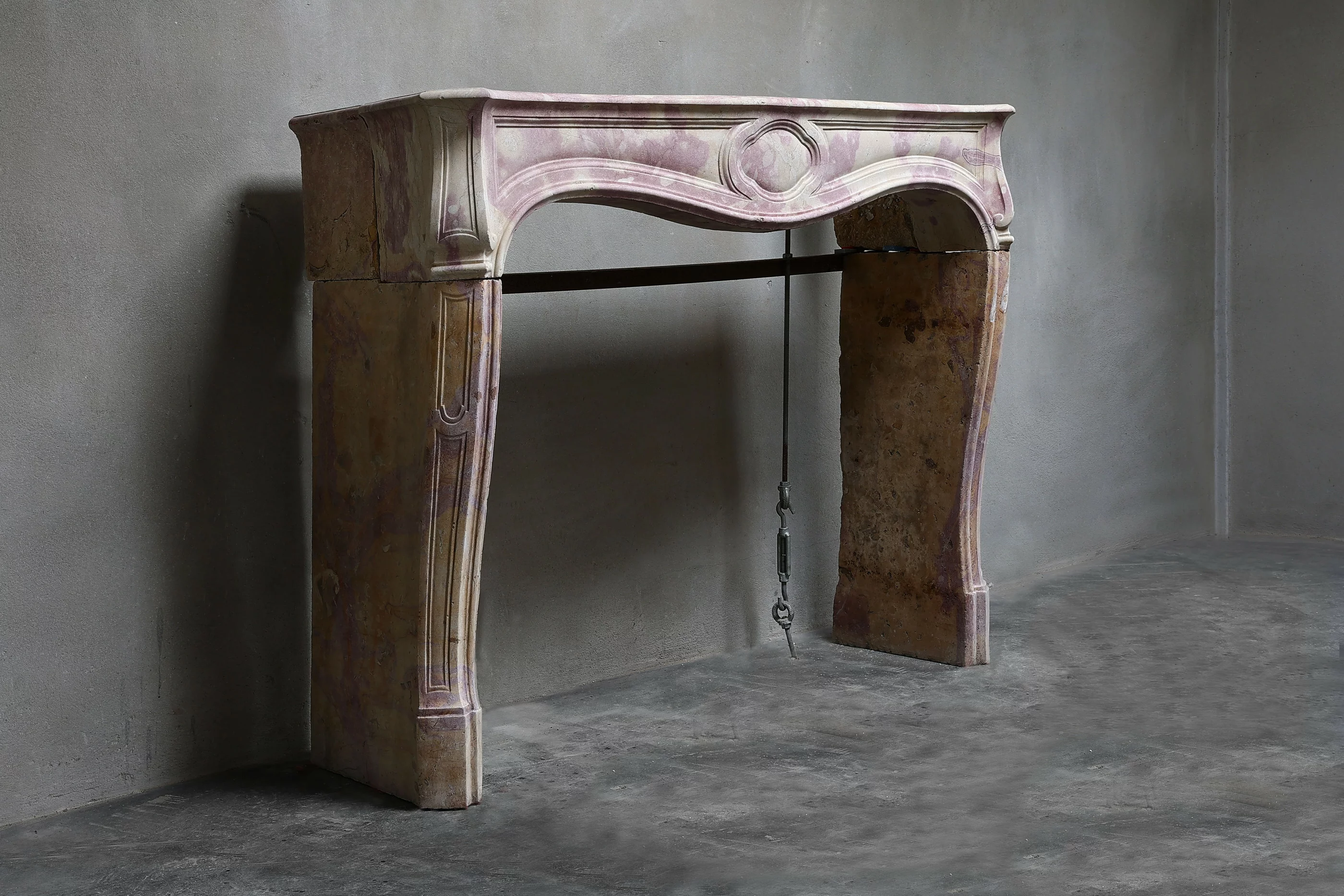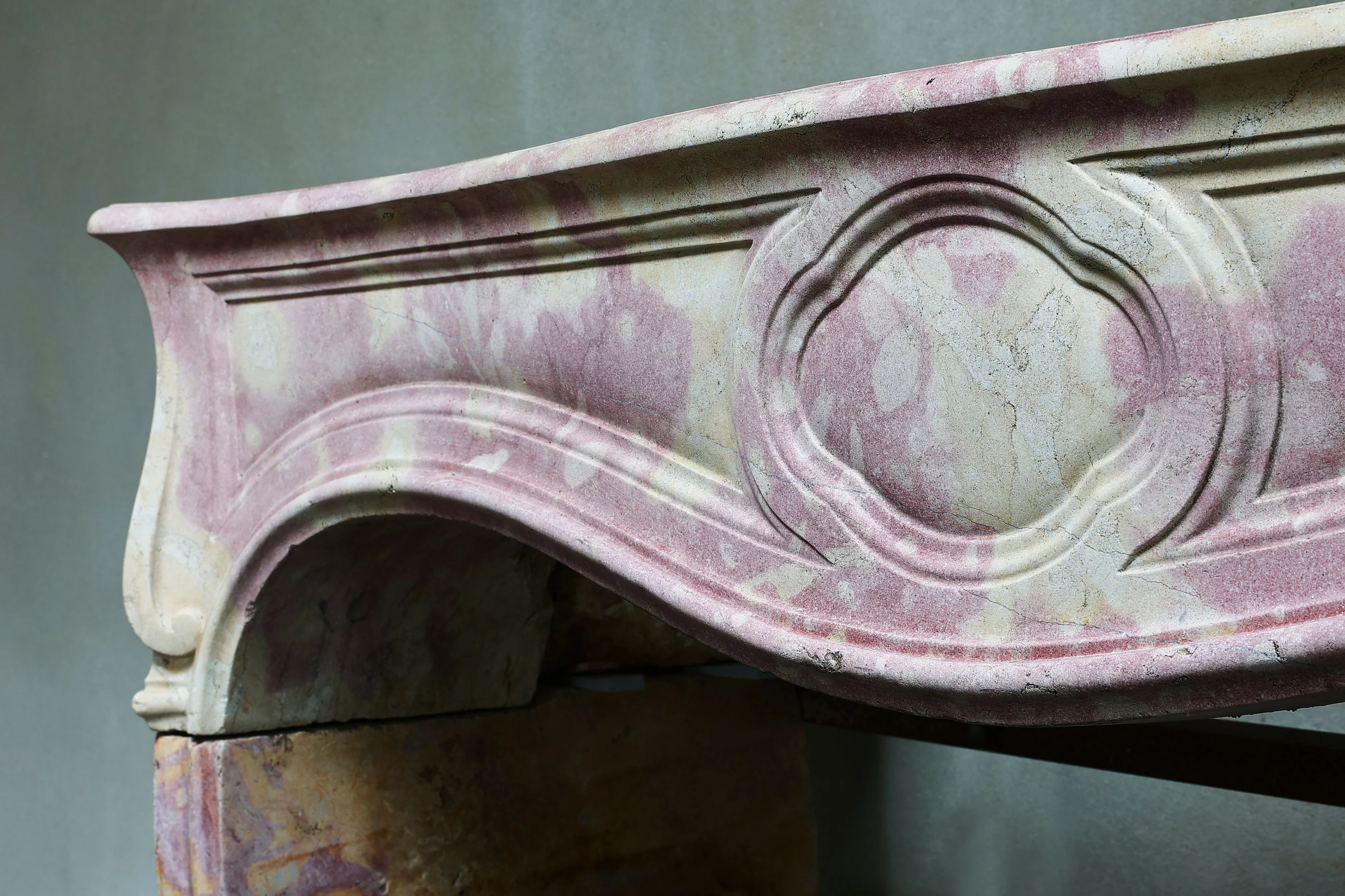 Zeer bijzondere antieke schouw van bi-color marmersteen. Deze marmersteen geeft een unieke kleur aan de schouw. Het is een unieke schouw binnen onze collectie en is in stijl van Louis XV met mooie rondingen en ornamenten. Een chimney uit de 19e eeuw.