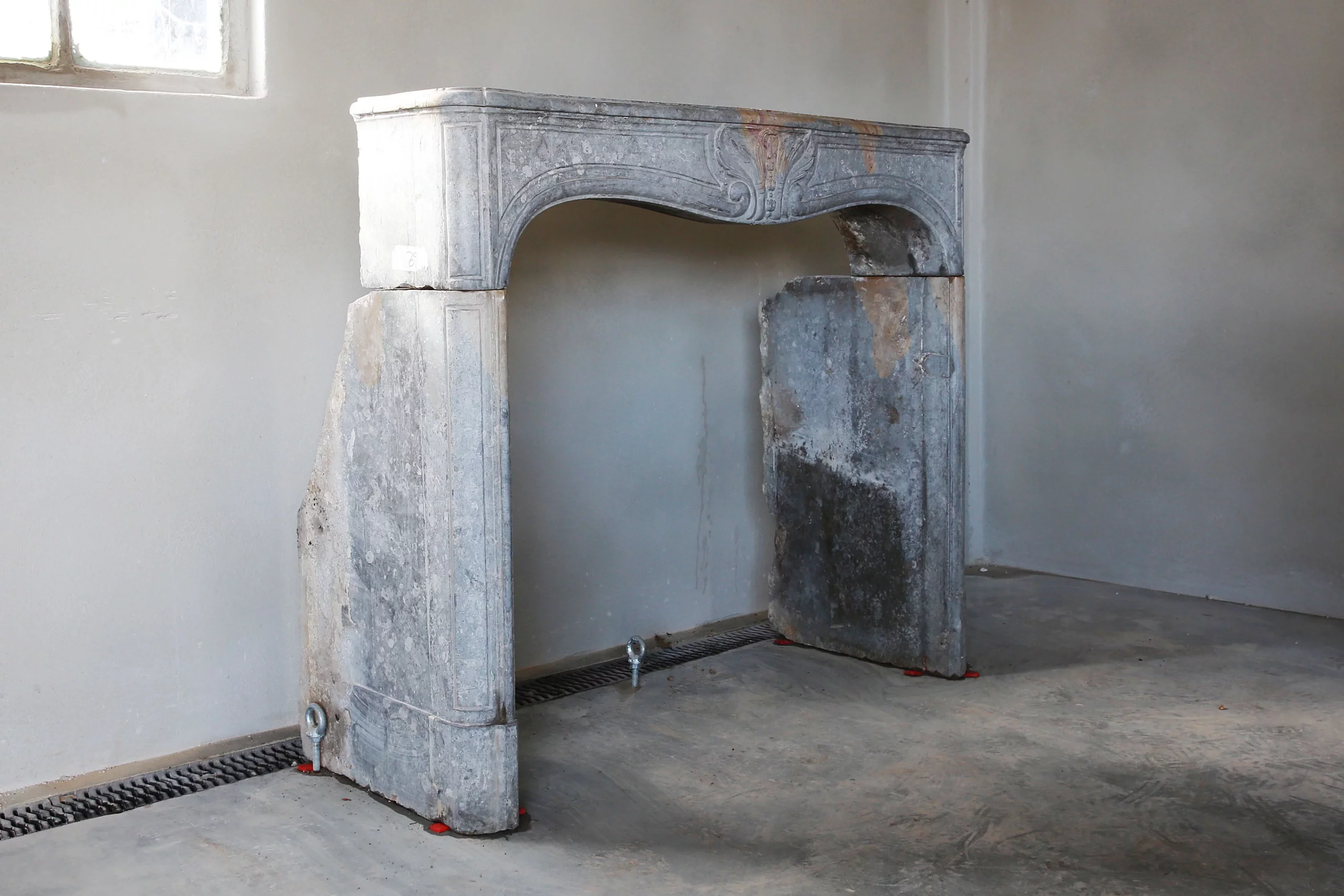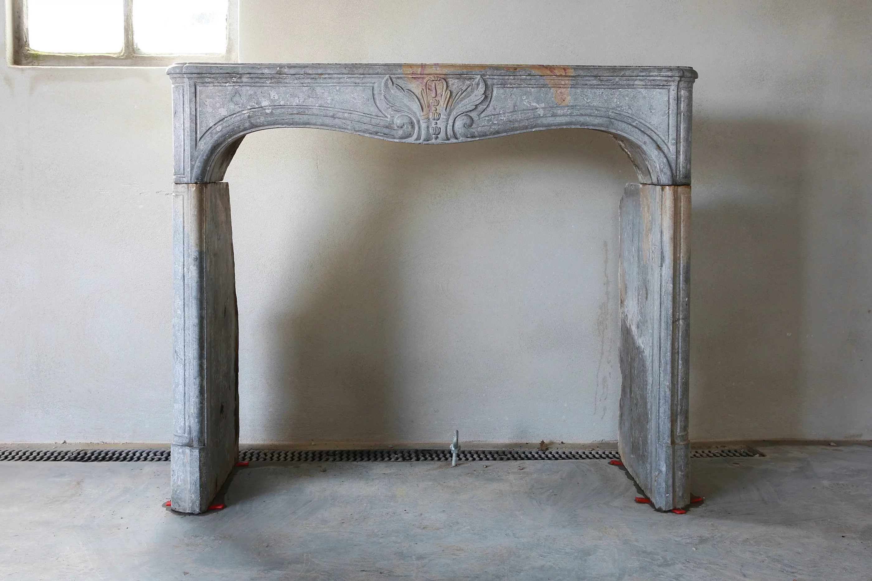 Prachtige antieke schouw van blauw-grijze marmersteen uit de regio Besancon, Bourgogne Frankrijk.