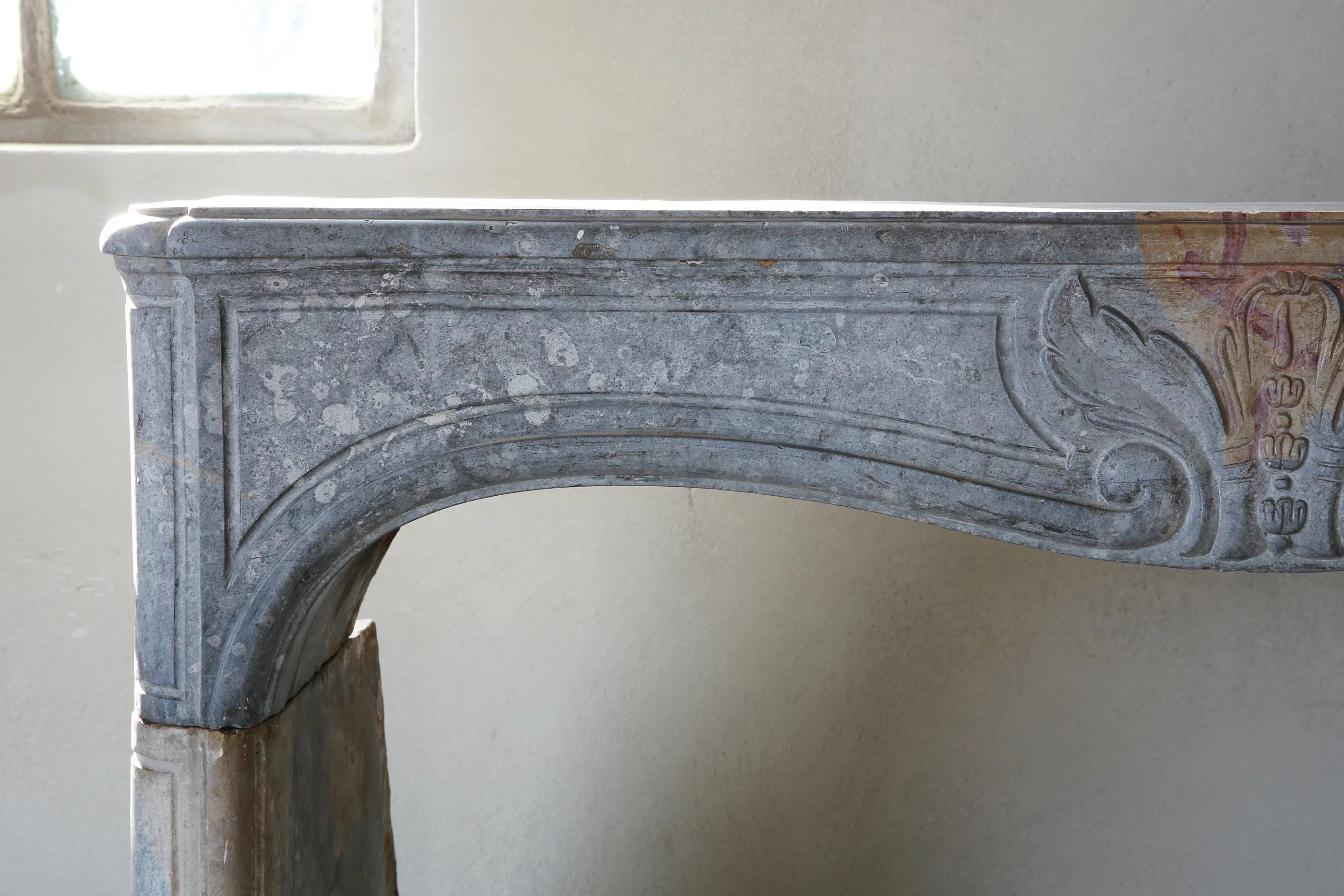 Deze antieke schouw kenmerkt zich enerzijds door fijn kapwerk en anderzijds met de typische kenmerken van onvolledige metamorfose waardoor de blauwgrijze basiskleur vermengd wordt met gele en zelfs rode kleurschakeringen. Een antieke schouw met deze tri-colores kleurschakering is uniek en komt slechts zeer zelden voor.