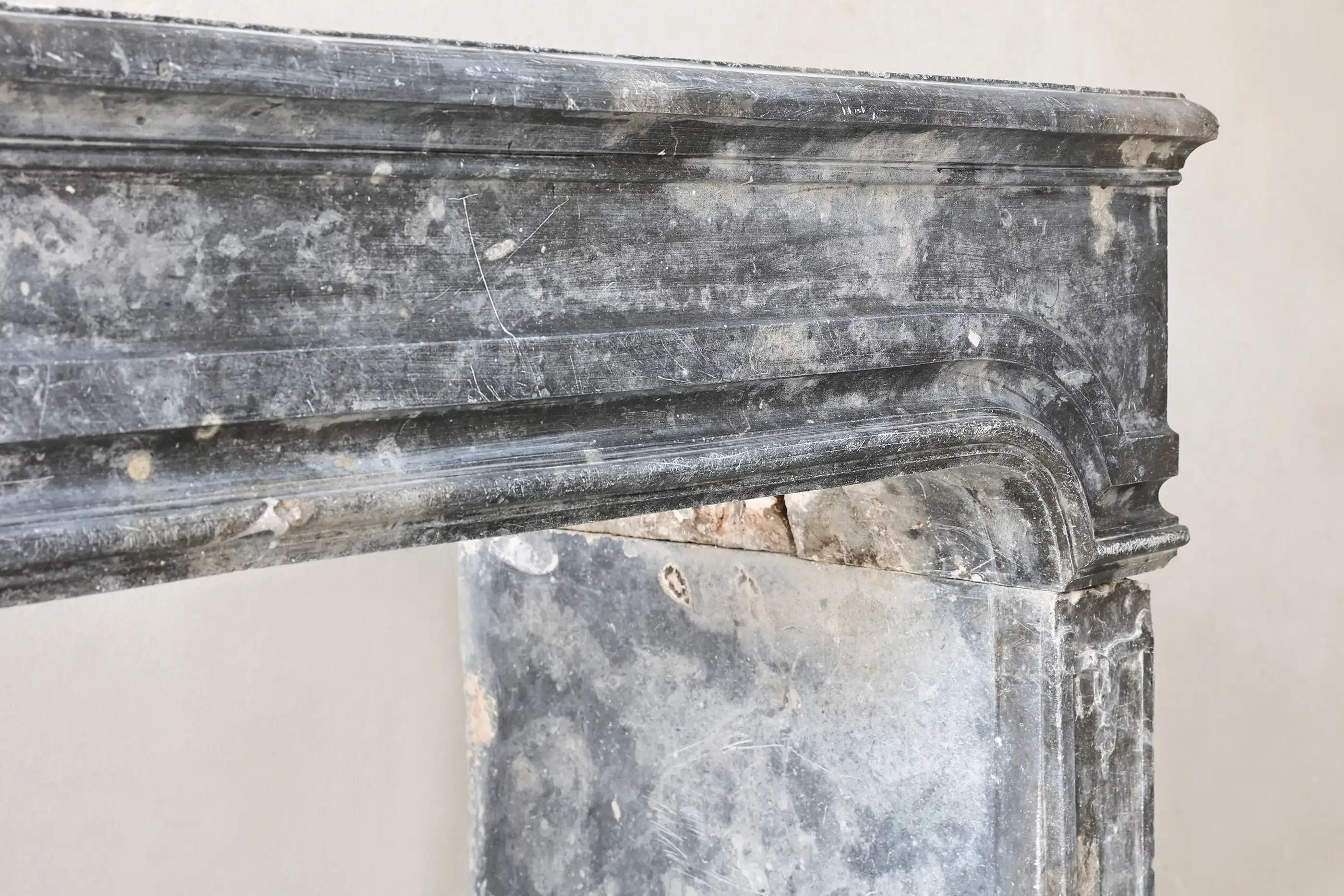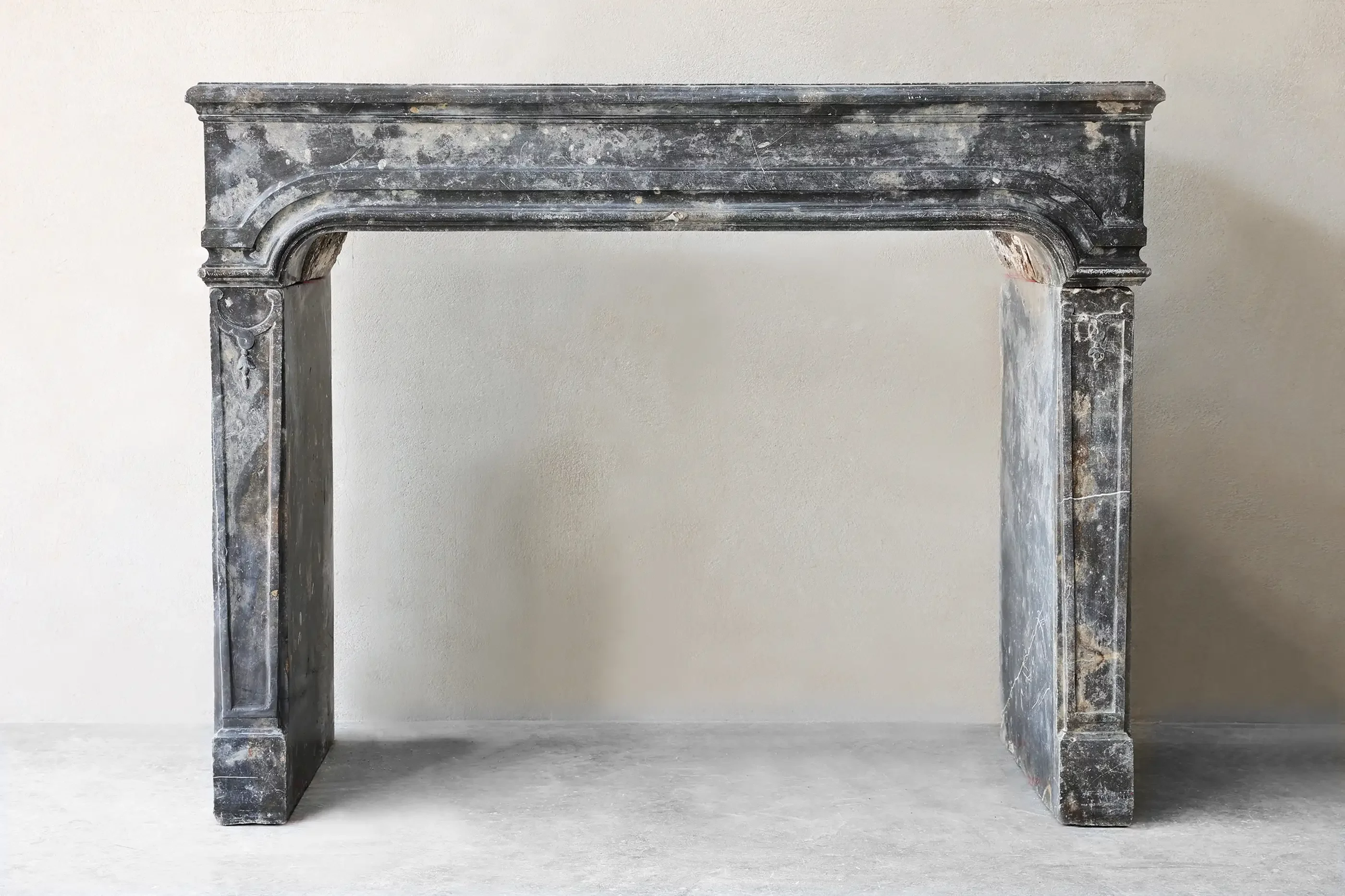 Prachtige 19e-eeuwse schouw uit de Louis XVI-periode, uitgevoerd in donker Bourgondische steen. Het sobere, elegante ontwerp met zachte rondingen maakt hem tijdloos en makkelijk te combineren.