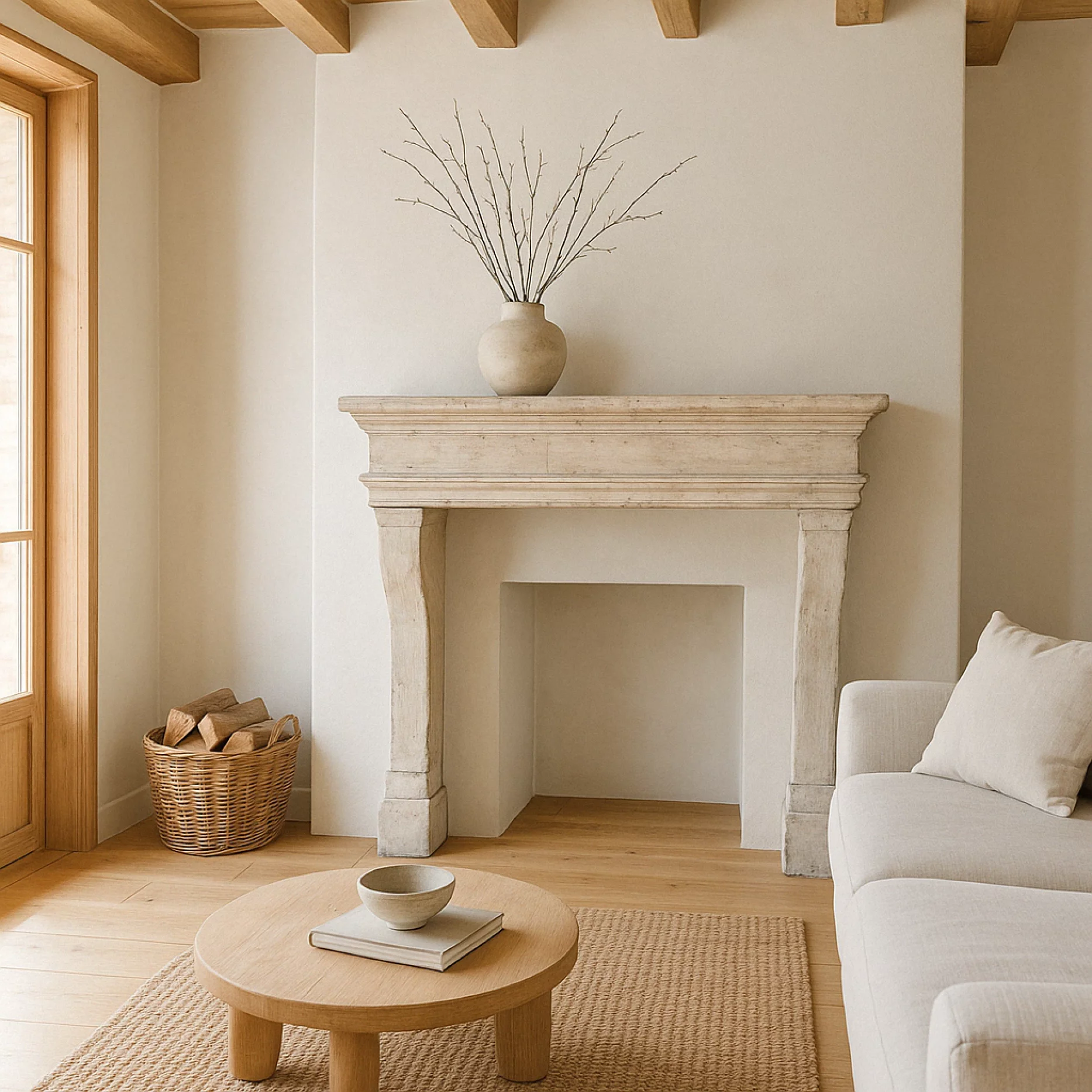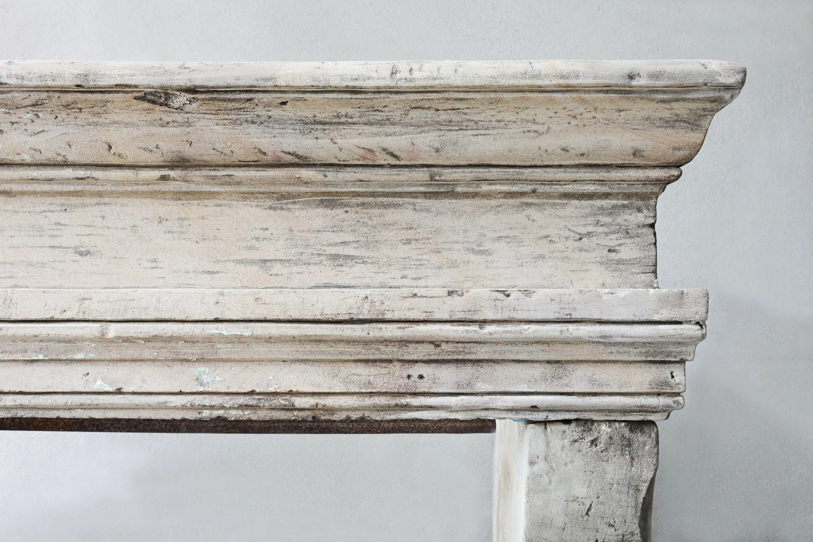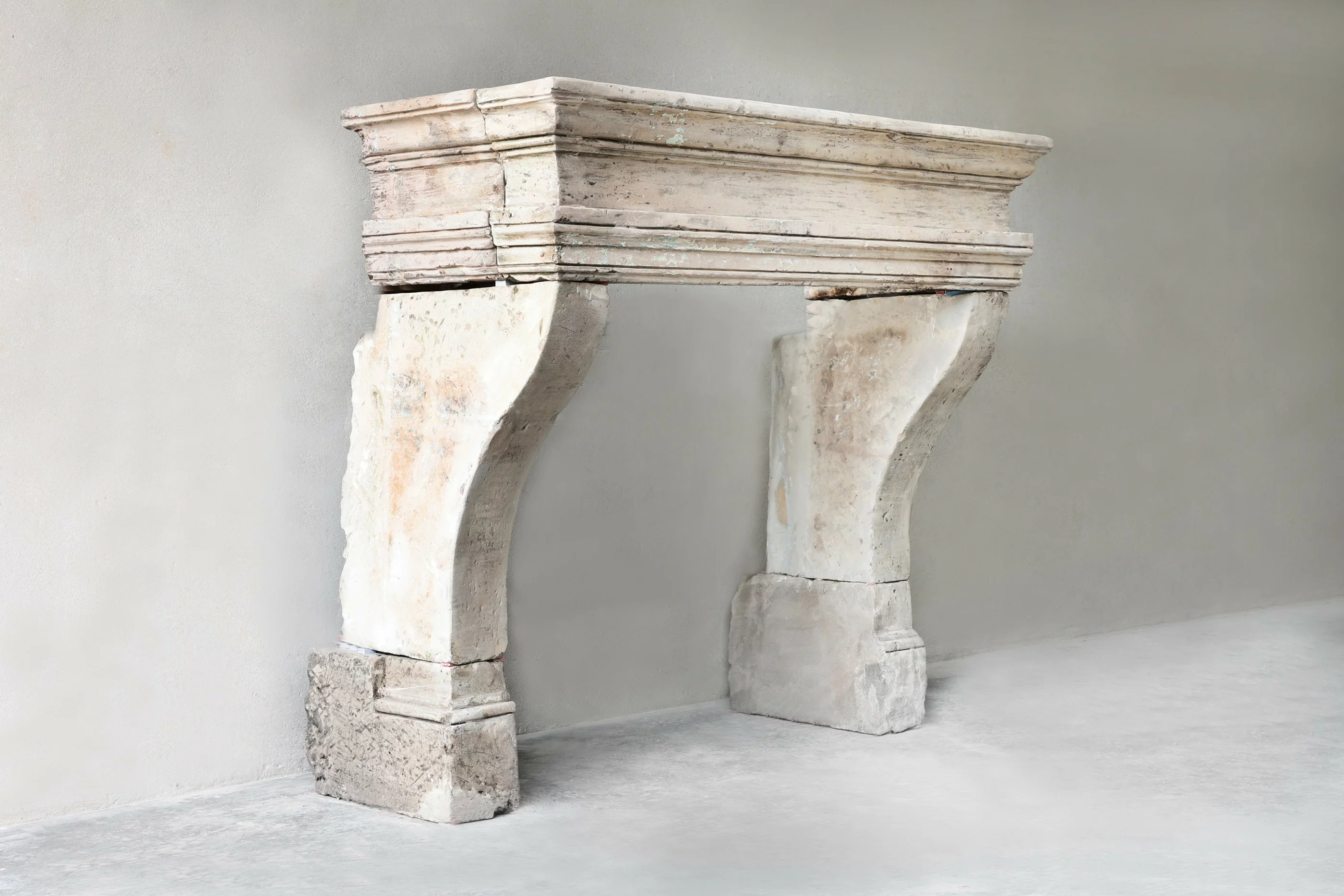Prachtige antieke schouw van Franse kalksteen uit de 19e eeuw in Campagnarde stijl. Deze mantel heeft een rustieke en warme uitstraling door de kleurstelling en mooie belijningen. Een schouw met een compact formaat, toepasbaar voor vele interieurs. De benen zijn licht gebogen en het bovenblad is robuust door de breedte, waardoor deze open haard een echte stoere uitstraling krijgt.
