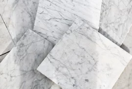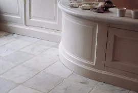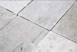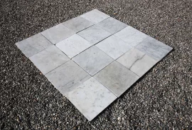 De randen zijn nog schuin bekapt, waardoor je goed kunt zien hoe oud deze vloer is. Deze oude marmeren vloer kenmerkt zich door een mooie schakering van wit-tinten.