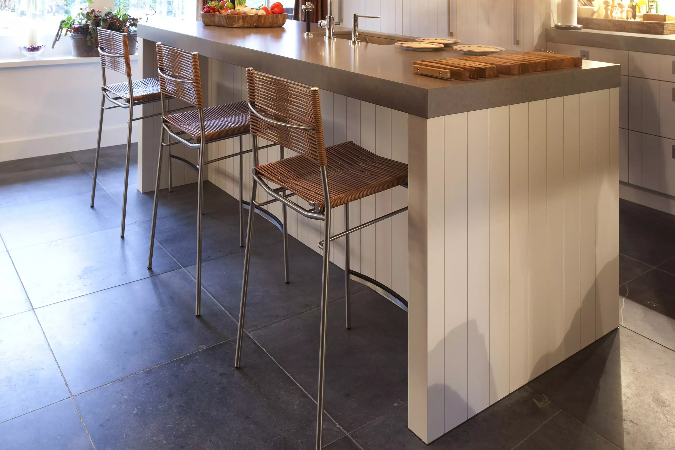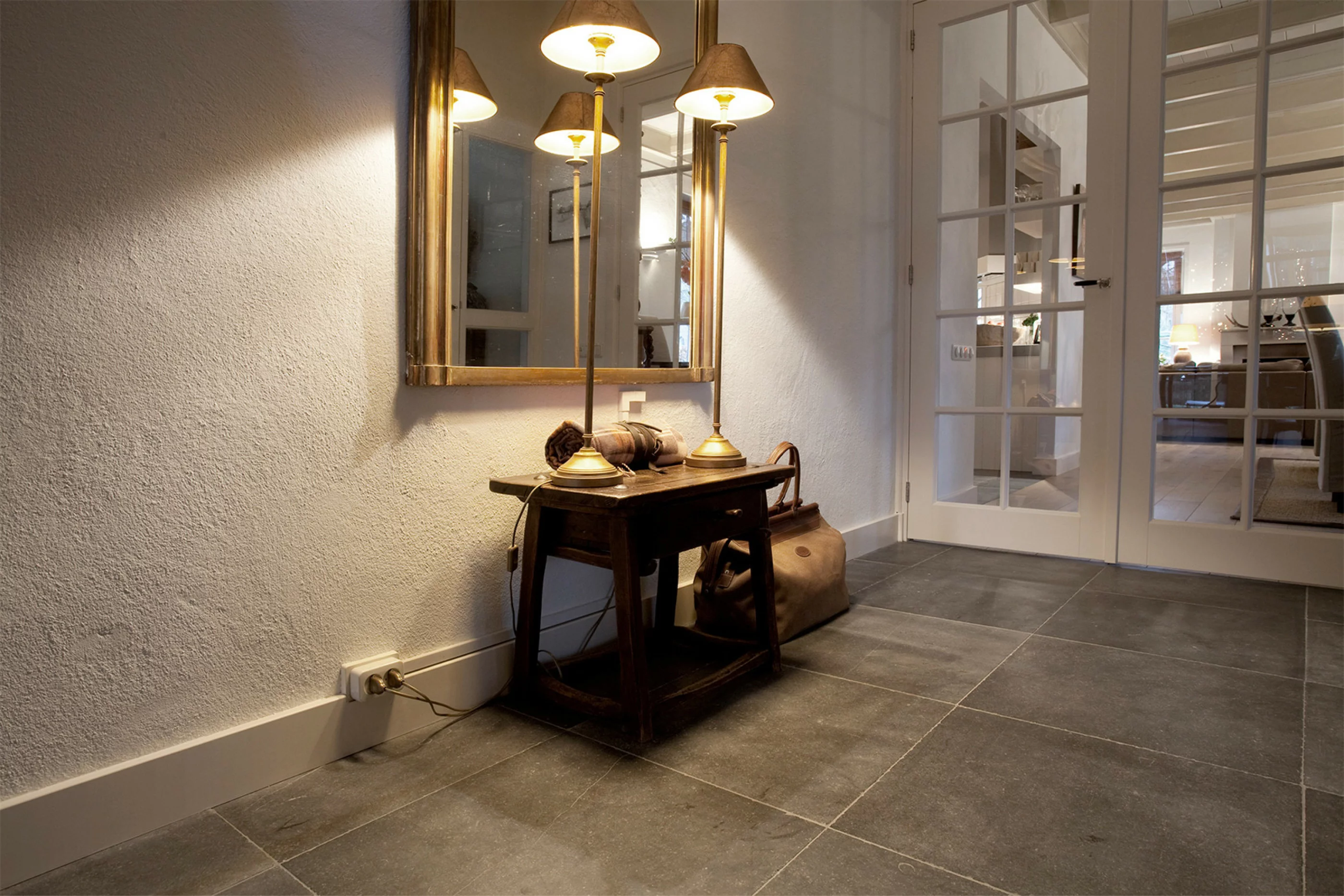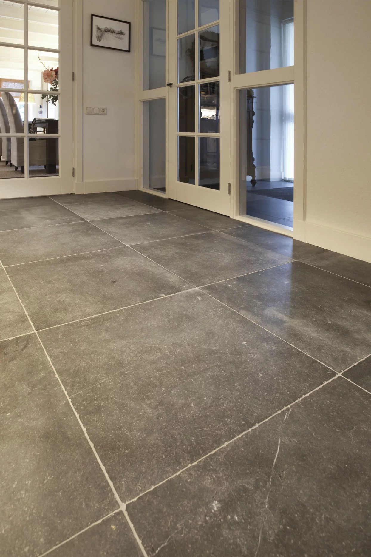 Wij kopen de platen in bij de blauwsteen groeve van Carrieres de Hainaut en Pierre Bleue Belge, zagen de tegels in het gewenste formaat en schuren de tegels met de juiste korrel en voldoende druk tot deze mooie matgrijze kleur. Prachtig......
