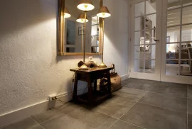 Onze vloer "Oud Brabant" wordt met de hand geschuurd met een hele groffe diamant korrel zodat de vloer mat blijft. Wij zijn gecharmeerd van rustige matte natuursteen vloeren. Wij kunnen deze geschuurde Belgisch hardsteen vloer in alle formaten leveren.