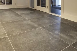 Wij kopen de platen in bij de blauwsteen groeve van Carrieres de Hainaut en Pierre Bleue Belge, zagen de tegels in het gewenste formaat en schuren de tegels met de juiste korrel en voldoende druk tot deze mooie matgrijze kleur. Prachtig......