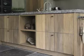 Deze vloer wordt helemaal met de hand verouderd en daardoor kunnen we de vloer in alle maten leveren tot wel 100 cm x 100 cm. Het plaatsen van deze natuursteen vloer in een puur wildverband is ook heel mooi. Dit geldt ook voor de combinatie met onze eiken vloeren.