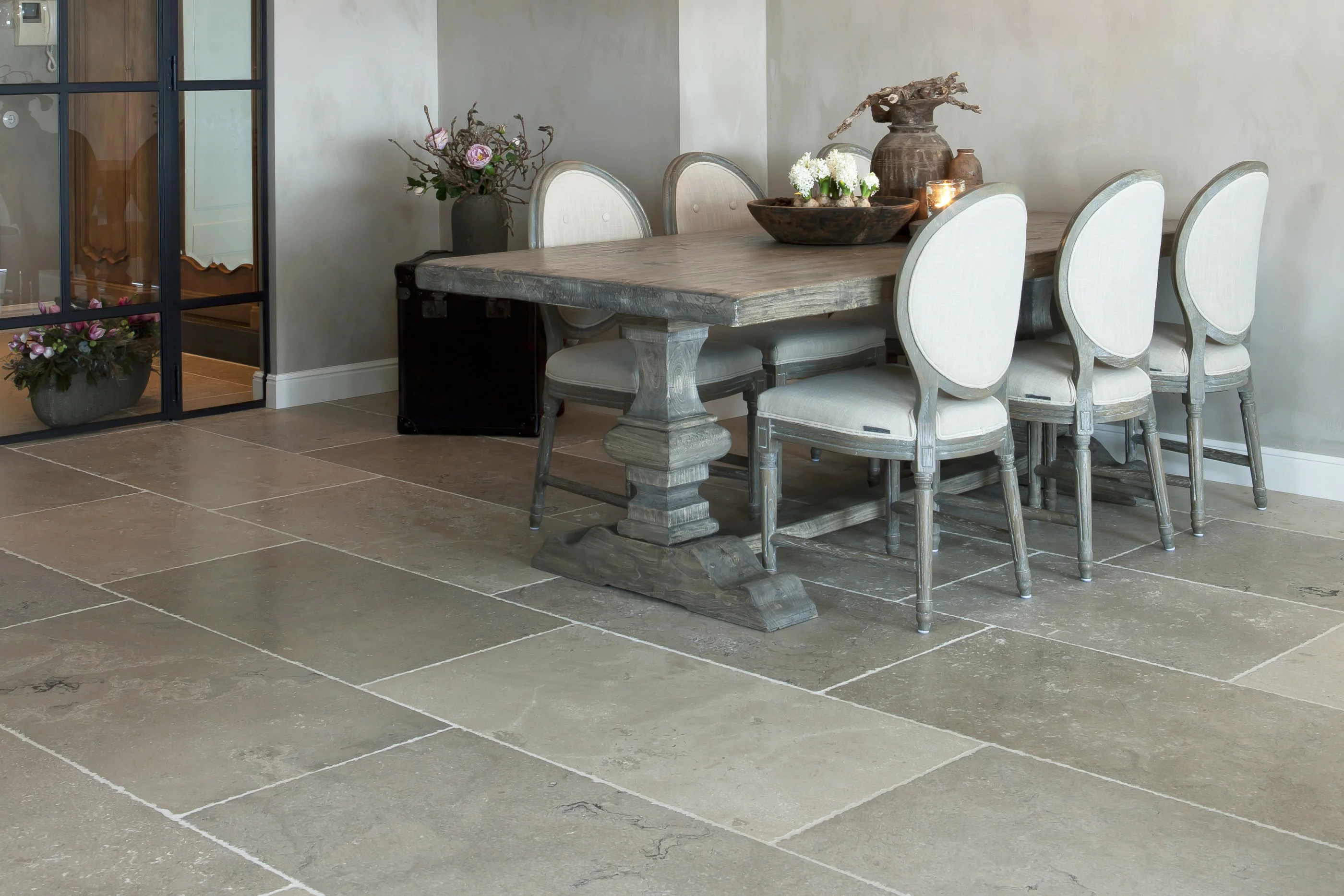 Een prachtige vloer van Bourgondische dallen. De mooie kleurschakering en authentieke uitstraling zorgt ervoor dat uw vloer sfeervol en tijdloos is en blijft.