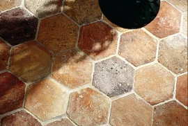 Hele fraaie hexagonale plavuizen in een rood/bruine kleurstelling. De vorm van de plavuis maakt dat deze vloer net even een andere uitstraling krijgt.